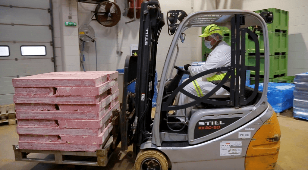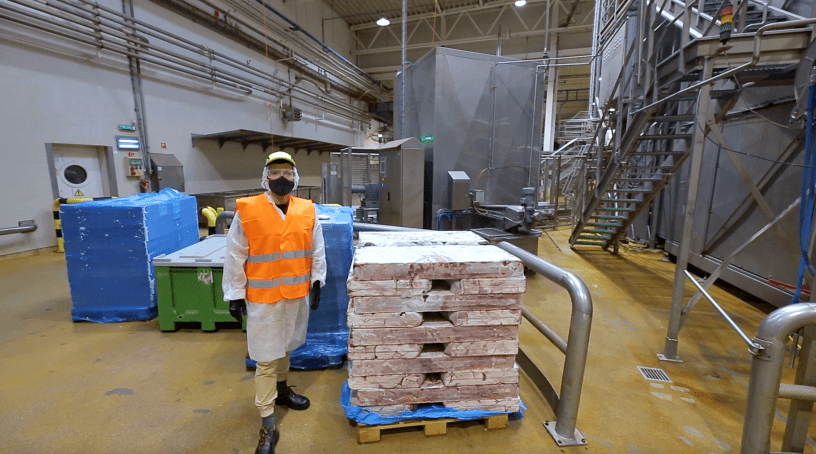 Az alapanyagot először a darálóba öntik, aminek extra éles kései pikk-pakk apró darabokra vagdossák a húst, még így fagyasztott állapotban is.