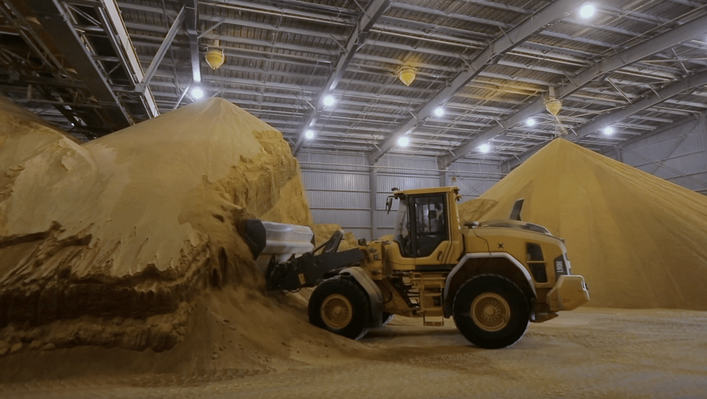 A szárított takarmány, avagy itteni nevén DDGS /Distillers Dried Grains with Solubles/ egy hangárba kerül, ahol óriási kupacokban tárolják. Mivel a keményítő a desztilláció során távozott, a DDGS a normál takarmányhoz képest koncentráltabb belső fehérjetartalommal bír. /A szárított kukoricatörkölynek nagyjából 35% a fehérjetartaloma, a sima kukoricadarának ehhez képest csak 9%. /