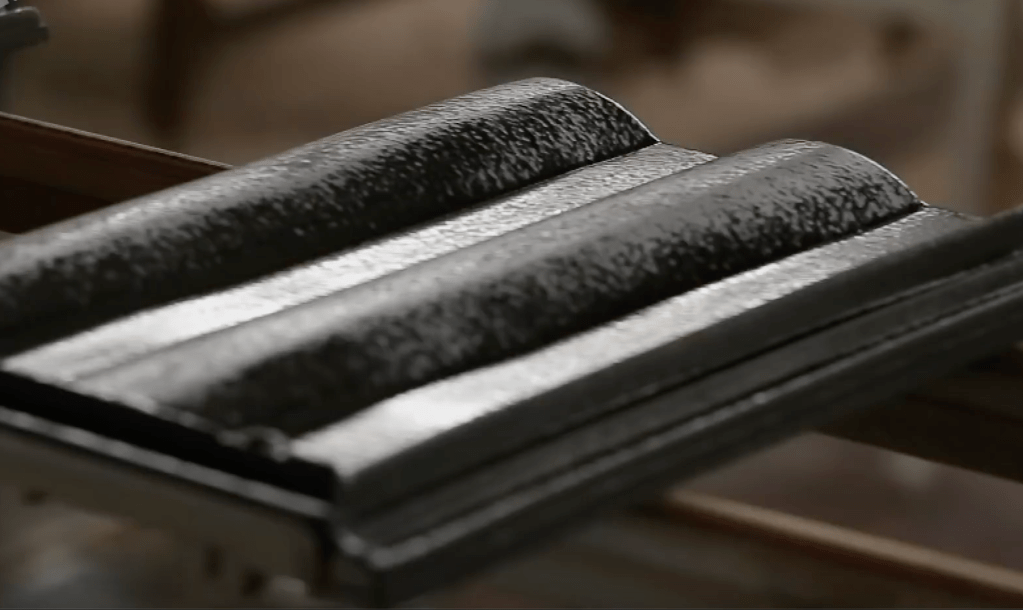 A következő lépés a sajtolás. A sajtóló berendezésen belül az előzőleg méretre vágott agyagtáblák két gipszforma közé kerülnek és a nyomás hatására megszületik a cserép végleges formája.