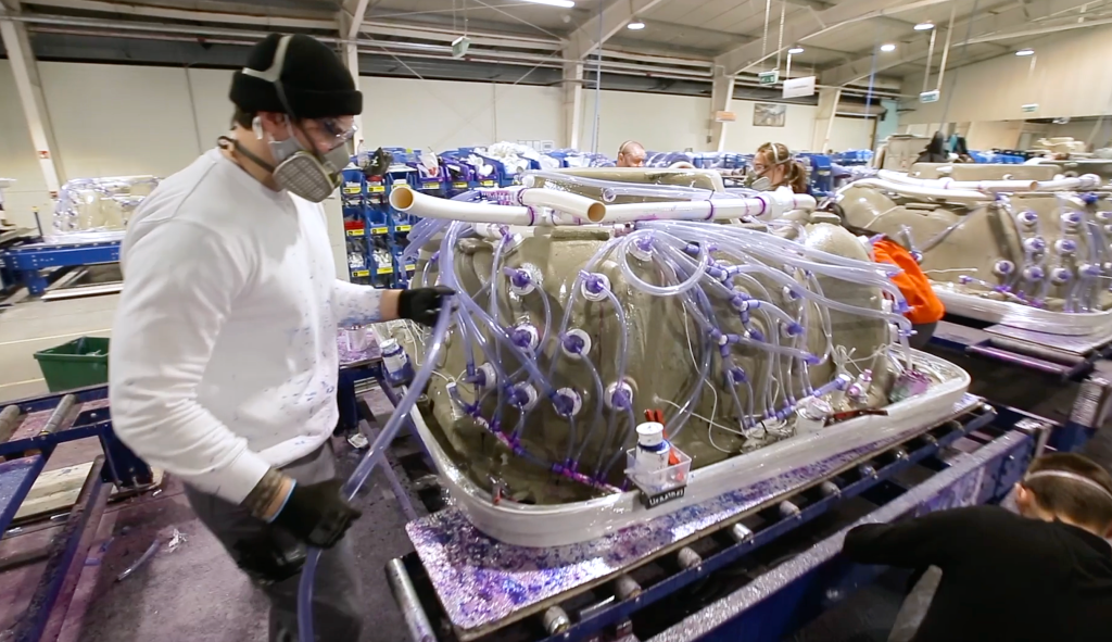 A medence ebben a formájában még képlékeny és rugalmas, következő lépésben tehát merevséget kell neki adni. Egy zárt kabinban poliuretán habot szórnak a műanyagra (ettől lesz kemény), majd pár perc pihentetést és dermedést követően egy másik kabinban cnc robotkarok kivágják a majdani fúvókák helyét.