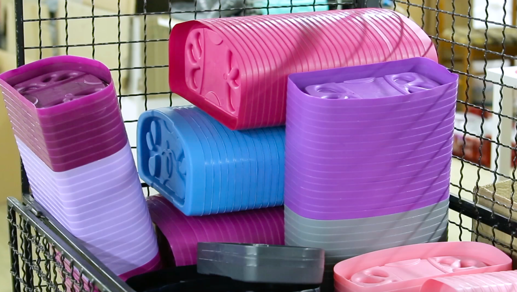 A szövet és egyéb szintetikus részekhez képest a táska összfelületéből kisebb részhányadot tesznek ki, de ettől még nagyon fontosak a különböző műanyag alkatrészek, ilyen például az alsó rész. A műanyag elemek is döntően itt helyben készülnek, granulátummal dolgozó fröccsöntőgépeken.