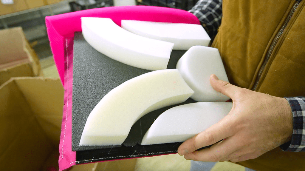 A műveletek közül talán a háti rész összeállításának fázisai a legérdekesebbek, a hátfalak ugyanis bordázott, párnázott szivacsrészekkel készülnek.